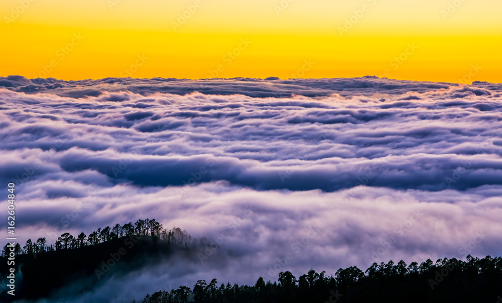 Amazing view of mountain peaks with beautiful clouds on the sunset. Location: Tenerife, Canary Islands, Spain. Artistic picture. Beauty world.