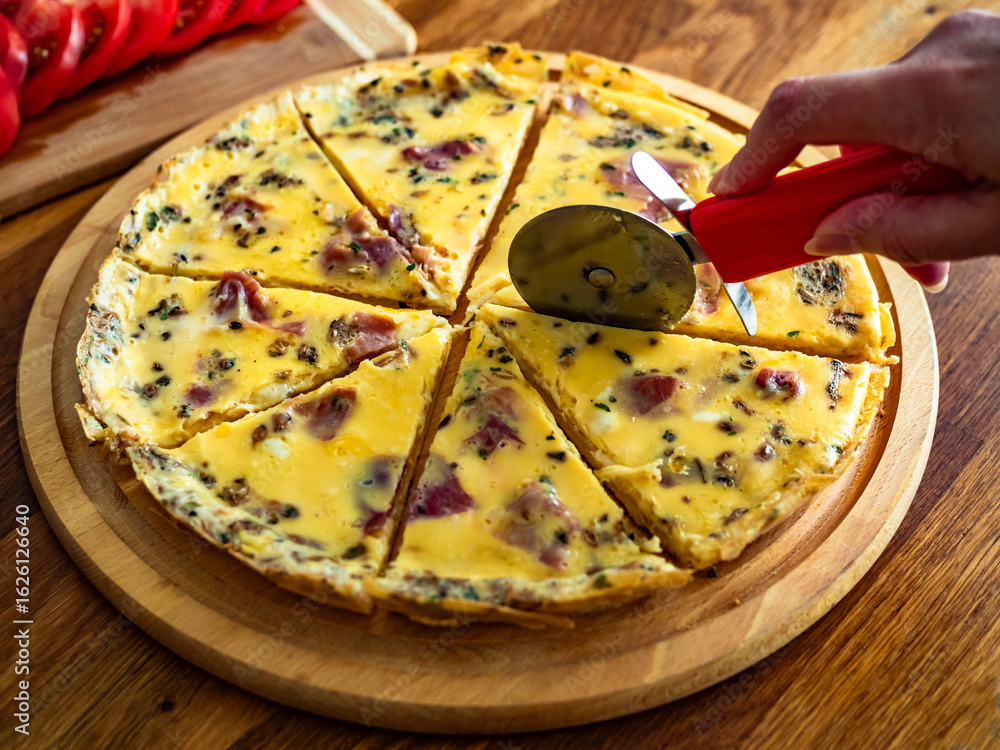 Cooking Frittata - scrambled eggs with cheese and cured ham on wooden kitchen table, close-up