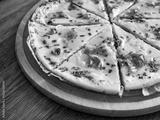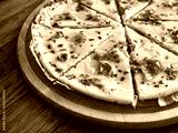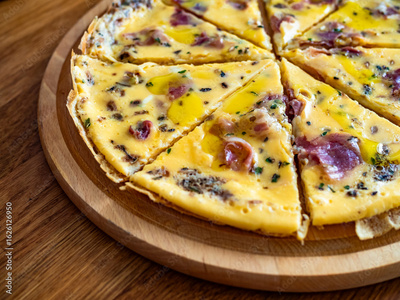 Frittata - scrambled eggs with cheese and cured ham on wooden table
