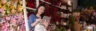 Asian adult florist small business owner manages orders inventory using digital tablet technology at her beautiful artificial flower shop boutique