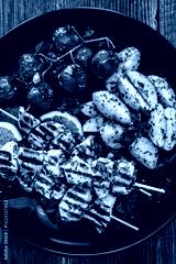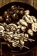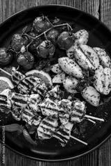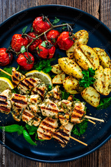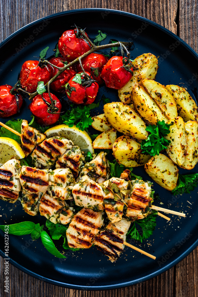 Greek style chicken skewers souvlaki with roasted potatoes and cherry tomatoes on wooden background