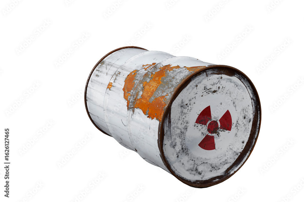 White or gray dirty barrel with radioactive waste. Nuclear warning sign. Rusty dangerous barrel with radionuclide, hazardous toxins on isolated background
