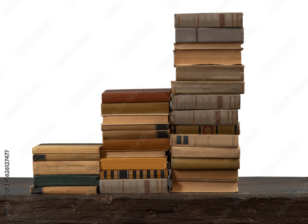 Stacks of many books on a shelf or table on an isolated background. Concept of library, reading, old classic literature