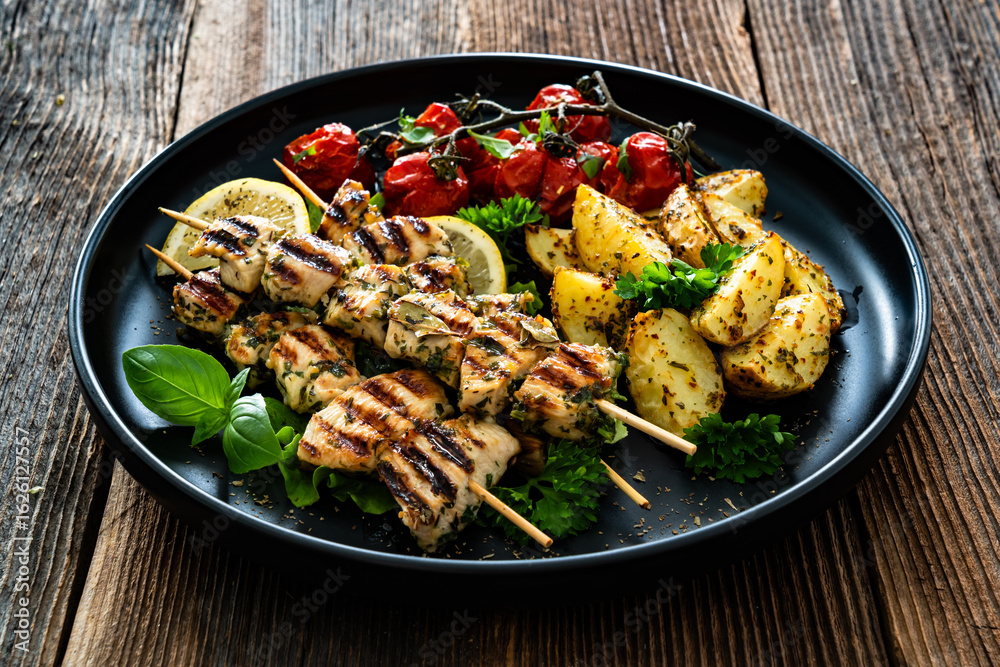 Greek style chicken skewers souvlaki with roasted potatoes and cherry tomatoes on wooden background