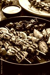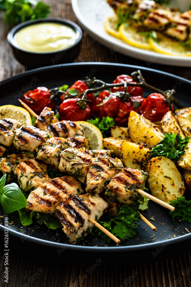 Greek style chicken skewers souvlaki with roasted potatoes and cherry tomatoes on wooden background