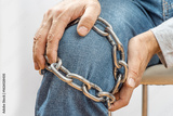 Arthritis symptoms, suffering from pain. The hands of the senior man massage a painful. Chain symbolizing inflamed male knee, stiffness of movement. Old age, health. Close up view..