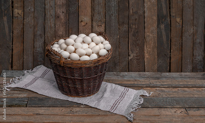 Chicken eggs in large wicker basket with wall of chicken coop, barn or wooden grunge fence in the background. Countryside setting