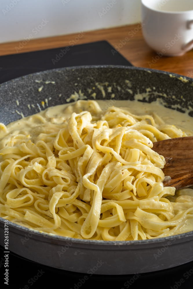 Cooking creamy chicken alfredo fettuccine pasta in frying pan