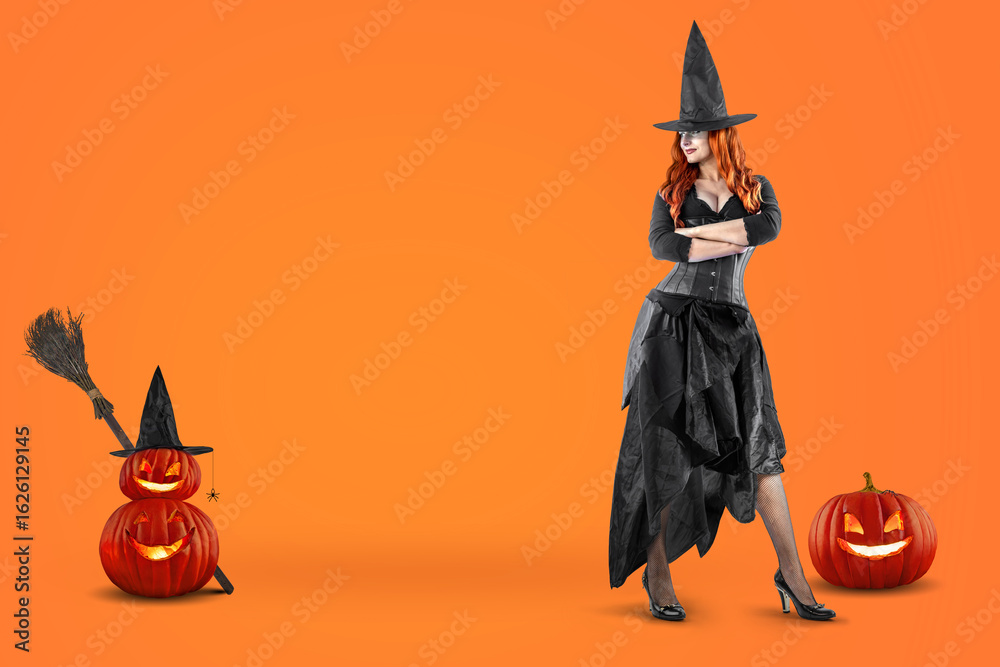 Witch on Halloween. Female wizard fairy character for All Saints' Day. Fantasy gothic red-haired Vampire girl in black dress. Enchantress dressed in carnival costume