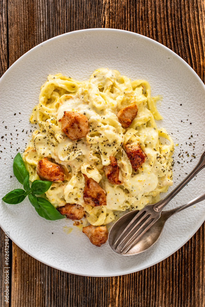 Classic creamy chicken alfredo fettuccine pasta on wooden table