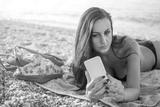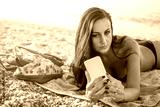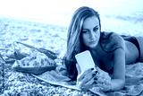 Young woman talking a self portrait with mobile phone while laying down on towel at the beach.