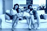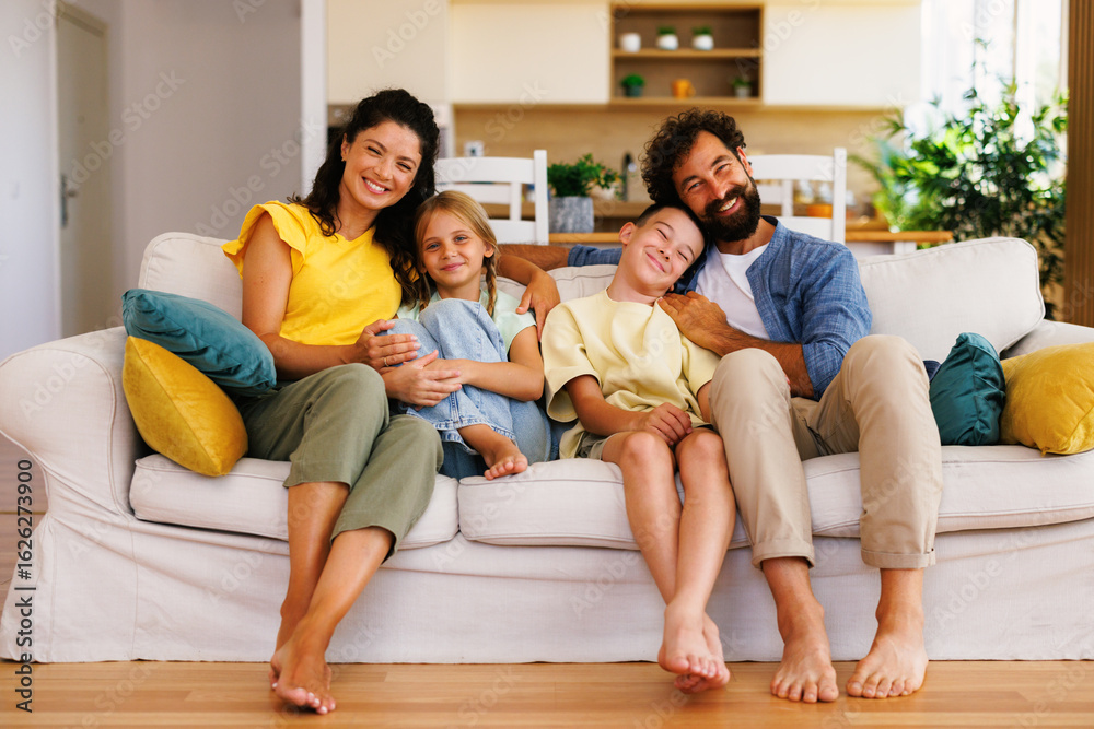 Happy family relaxing together on comfortable sofa at home