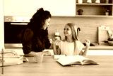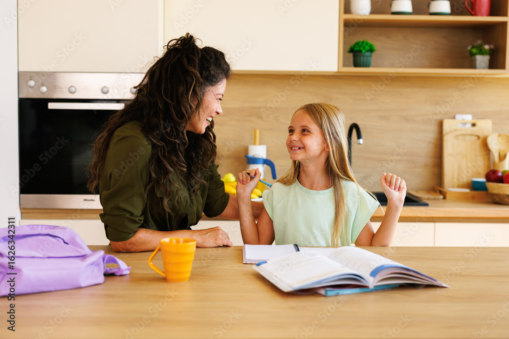 Mother and daughter celebrating successful homework in kitchen