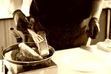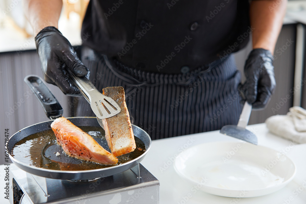 chef cooking salmon steaks in the kitchen