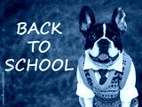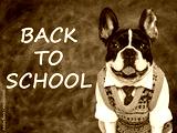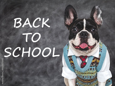 Back to school. Cute puppy and blackboard with inscription. Closeup, isolated background. Studio shot, day light. Concept of care, education, obedience training and raising of pet