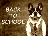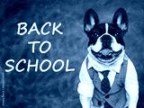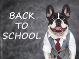 Back to school. Cute puppy and blackboard with inscription. Closeup, isolated background. Studio shot, day light. Concept of care, education, obedience training and raising of pet