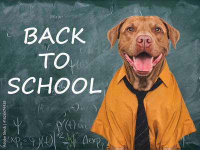 Back to school. Cute dog and blackboard with inscription. Closeup, isolated background. Studio shot, day light. Concept of care, education, obedience training and raising of pet