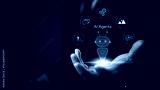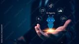 businessman holding a virtual interface with AI agents icons. automation, smart business solutions, and digital transformation. machine learning, data processing, and artificial intelligence.