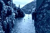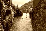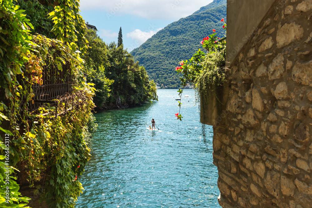 View of Ponte del lago, Nesso on Lake Como in Italy. Man paddling on a paddleboard Lake Como on a sunny summer day