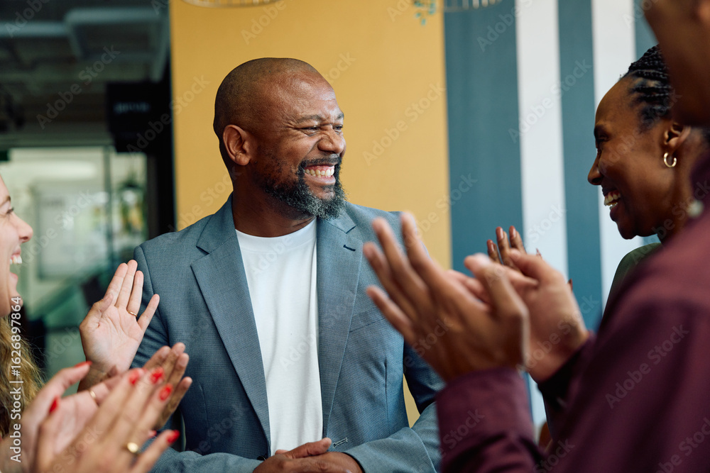 Group of diverse coworkers applauding mature businessman in office during daytime