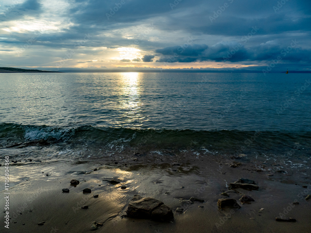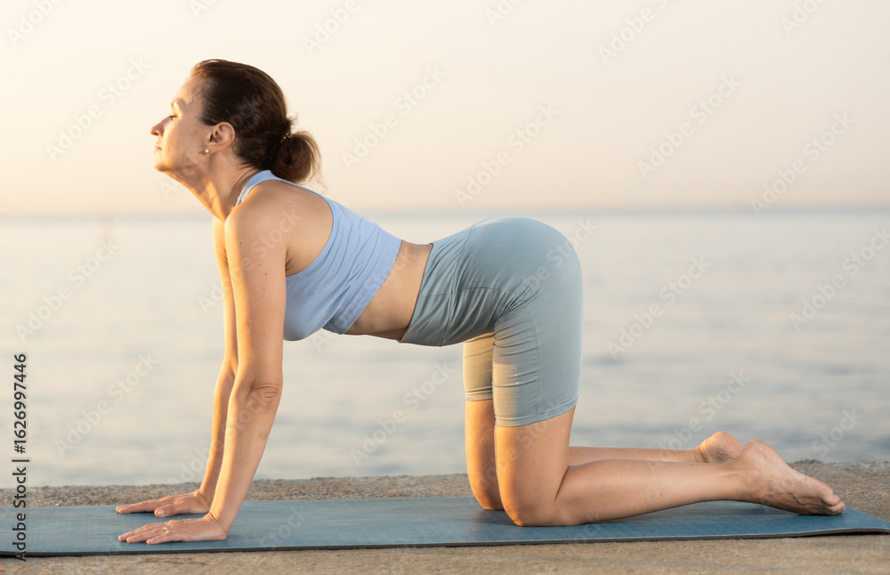 Skilled young female trainer performing cat-cow pose of yoga on seashore at sunrise outdoors