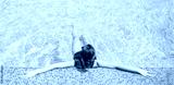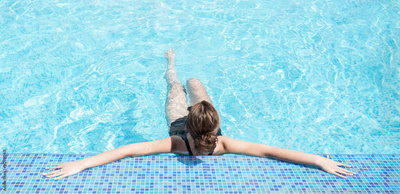 Young brunette woman relaxing in hotel pool. Panoramic top view of female figure in blue pool holding edge with legs in water. Wide composition with copy space. Summer vacation, travel banner designs