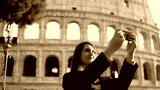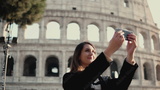 Young beautiful woman takes the selfie on smartphone. Woman walking in Rome, Italy near the Colosseum.
