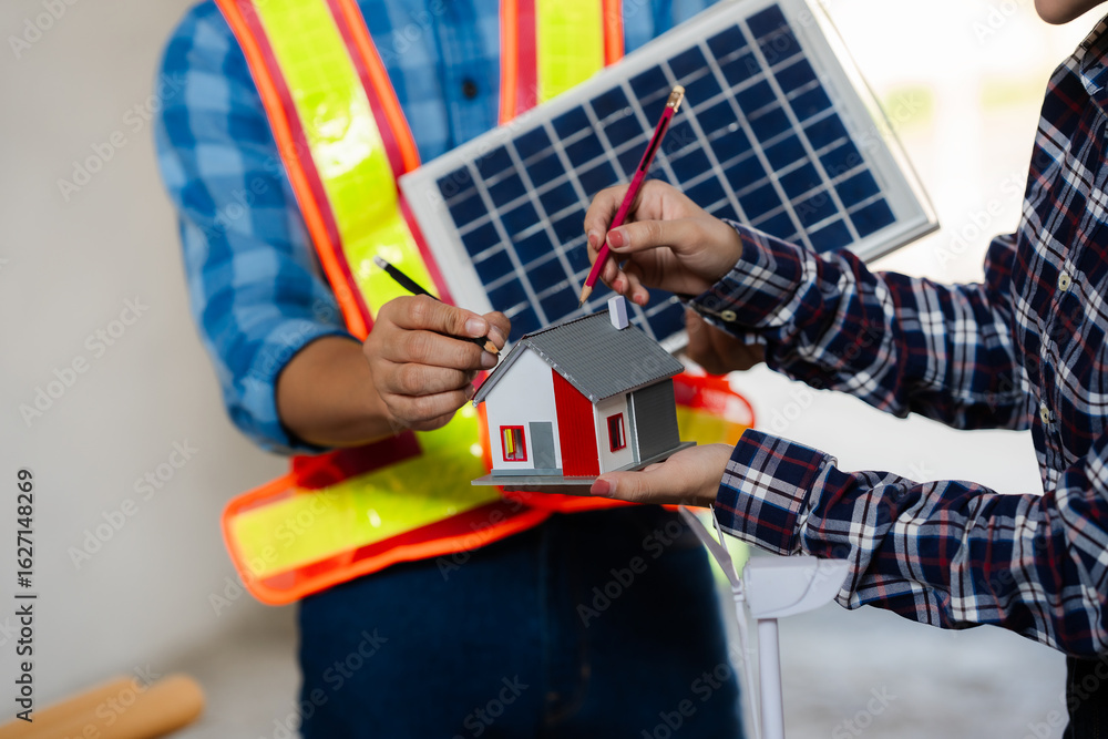 Engineers working on meeting blueprints to collaborate on projects with partners to create models and engineering tools on-site.