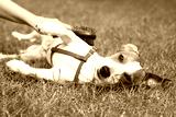 Czesanie psa.Kobieta szczotkuje swojego psa podczas zabawy.