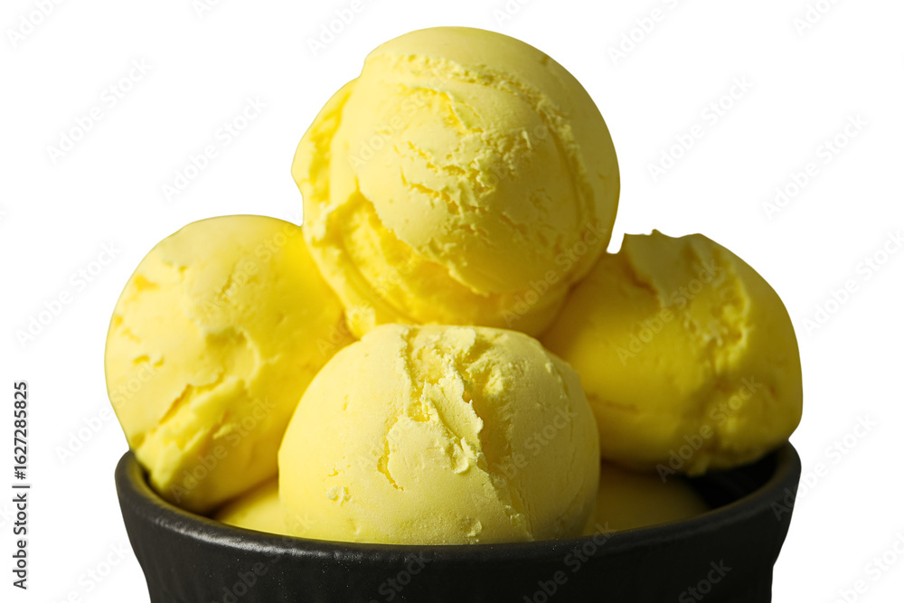 Bright yellow ice cream scoops piled in a bowl, isolated on white, PNG