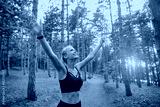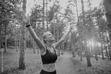The sports girl her hands up in the forest. Concept of victory motivation in sports.
