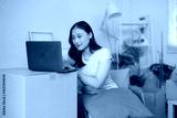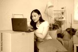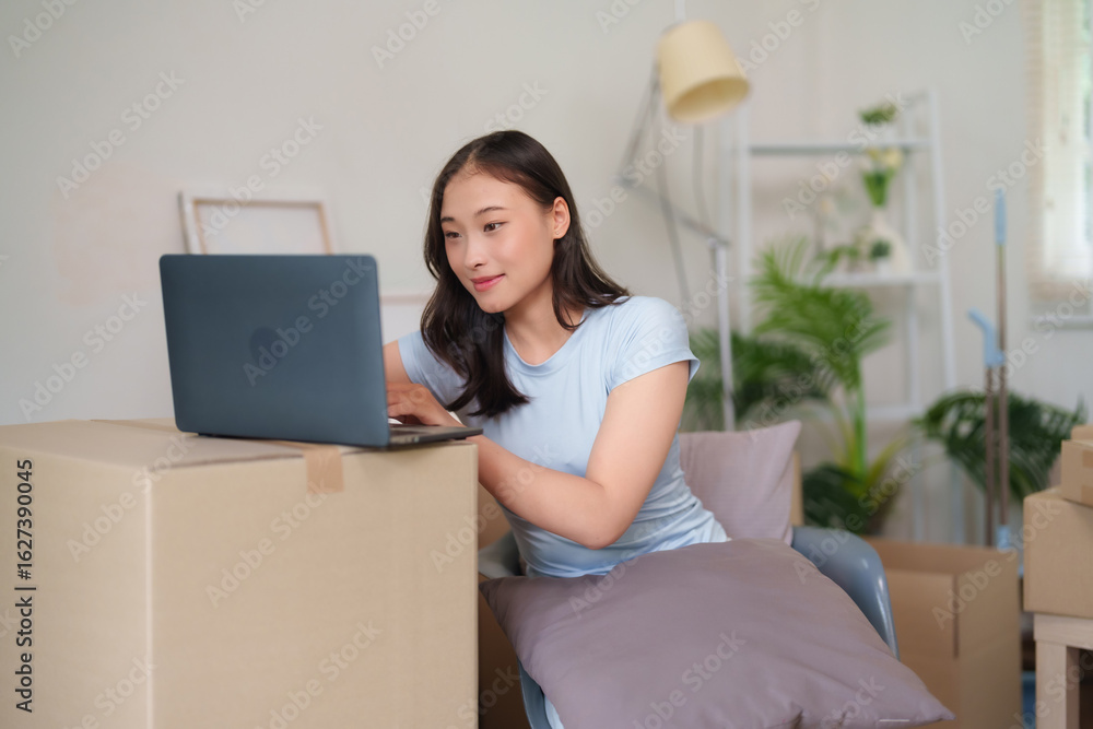 Asian adult woman uses laptop computer on moving boxes planning relocation new home setup unpacking apartment