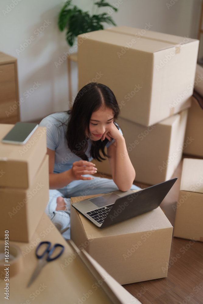 Asian Woman Uses Laptop Planning New Home Relocation Organizing Moving Packing Boxes For Efficient Transition To New Apartment Lifestyle