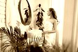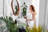 Woman drying her hair in a modern bathroom surrounded by plants in the morning light