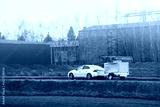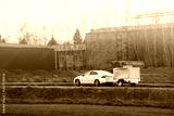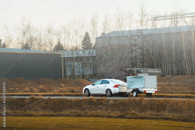 Family car towing trailer in rural area