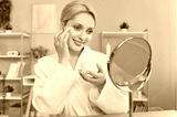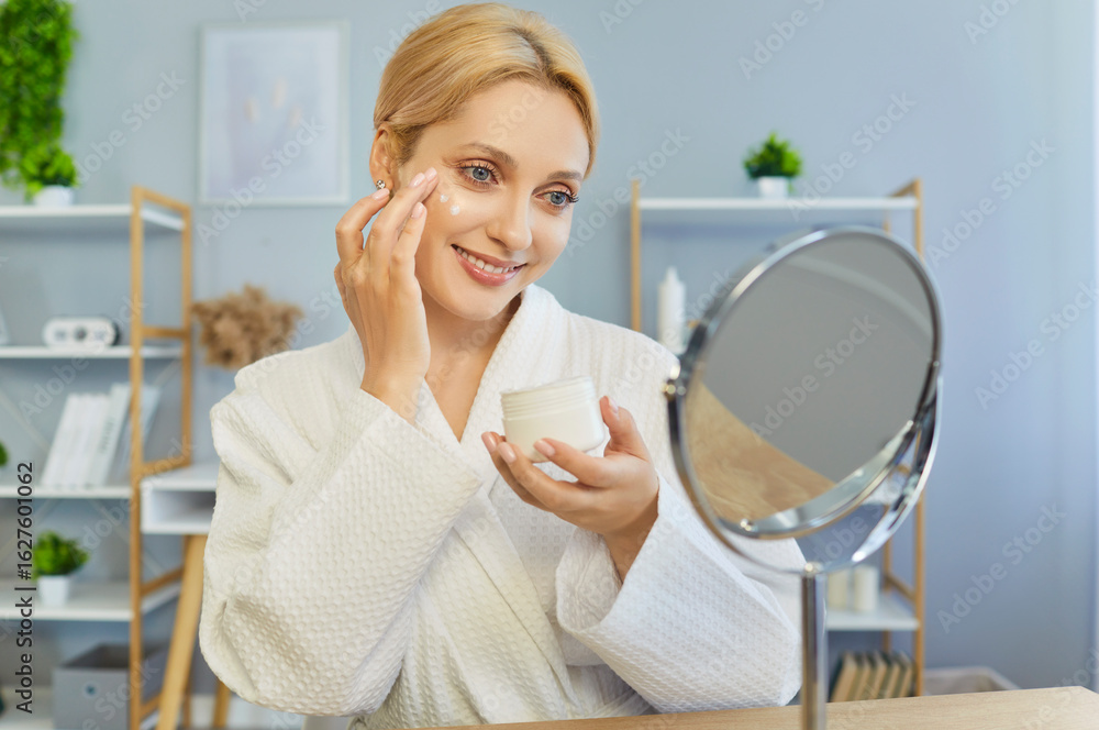 Young pretty woman looking at little mirror applying moisturizing cream on her face at home. Female person in white bathrobe doing morning beauty procedure. Body health and skin care.