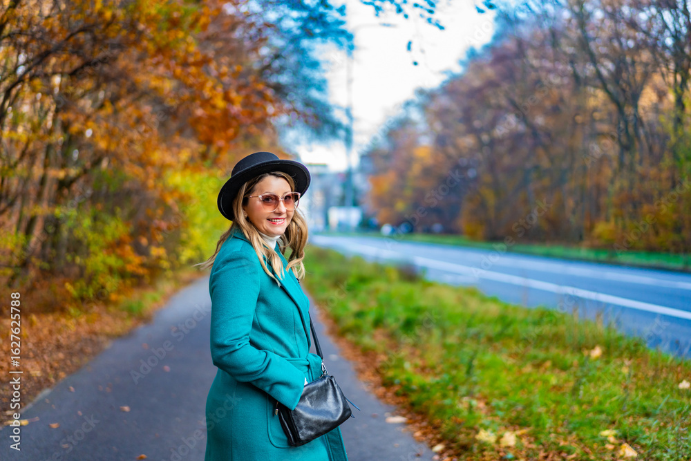 Beautiful mature woman during walk in autumn scenery in city. Side view