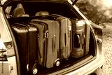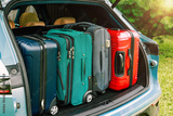 Car trunk is full of luggage. Open trunk of hybrid electric car with modern suitcases, ready for travel.