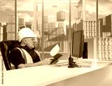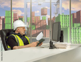 Man sitting in customs office. Logistics bureau manager. Sea cargo delivery business owner. Customs officer looking at monitor sitting at workplace. Man customs dispatcher near window in cargo port