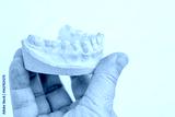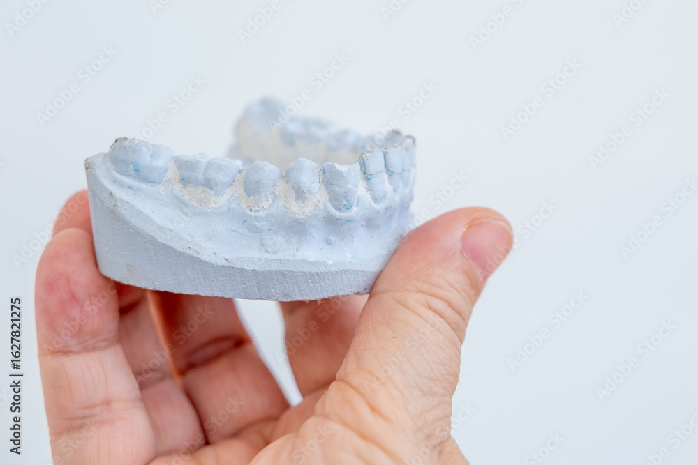 Two light dental plaster casts, Orthodontic models upper and lower jaw, Preparation for braces or dentures, teeth molds, dentistry concept