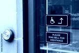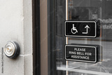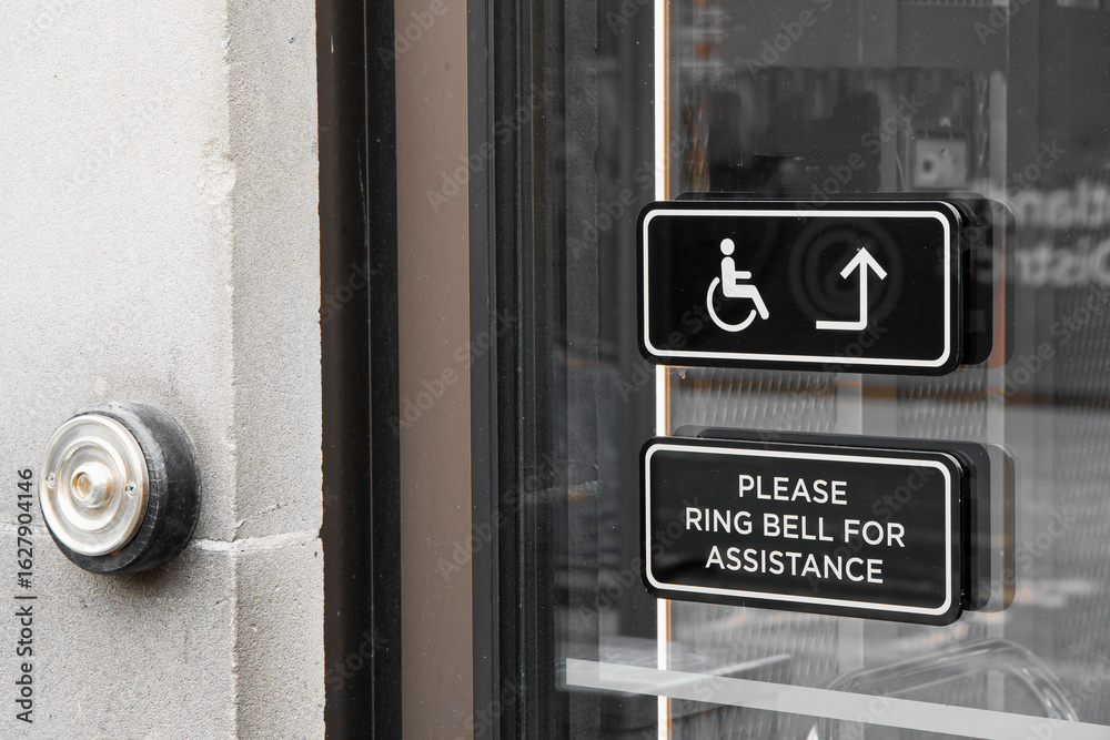 Disabled accessible push button buzzer for assistance sign at building entrance