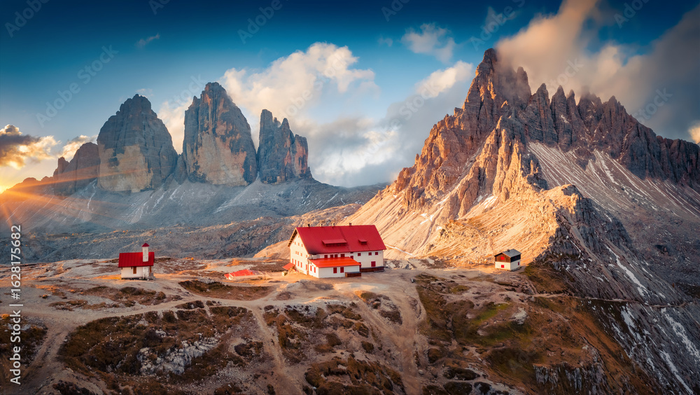 Fantastic summer sunrise on Dolomites with Paternkofel and Tre Cime Di Lavaredo mountain peaks on background, Italy. Wonderful morning scene of Italian Alps. Beauty of nature concept background.