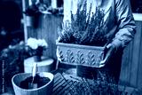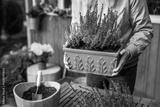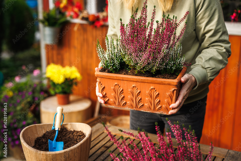 Woman holding flower pot with planted blooming heather while preparing cozy autumn floral decoration at backyard. Fall season gardening