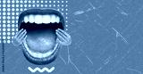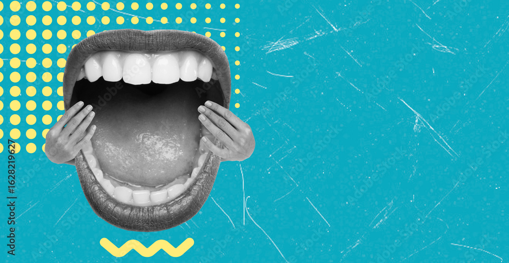 Art collage, Creative artwork featuring a large open mouth with hands on either side, against a vibrant blue background