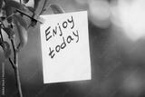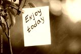 Motivating phrase enjoy today. On a green background on a branch is a white paper with a motivating phrase.