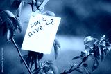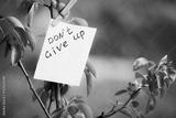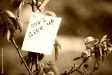 Motivating phrase don't give up. On a green background on a branch is a white paper with a motivating phrase.