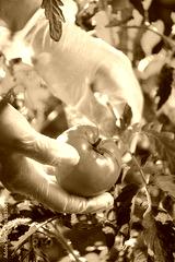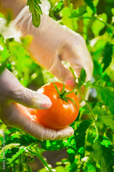 Close-up female hands of a farmer ripping a ripe tomato from a bush on a field.