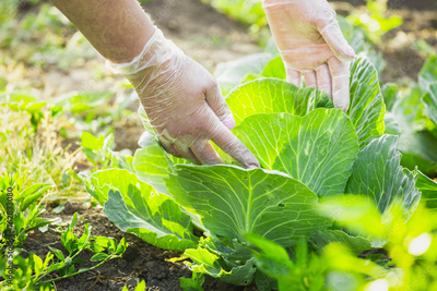 Close-up of a farmer's hands in gloves tear ripe cabbage from a garden bed