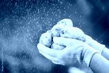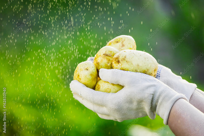 Close-up of a farmer's hand holding a young potato on a background of washed greens.