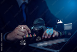 Businessman holds magnifying glass data analysis and artificial intelligence icons, with laptop command prompt. searching for insights.concept innovation, digital transformation, future technology.